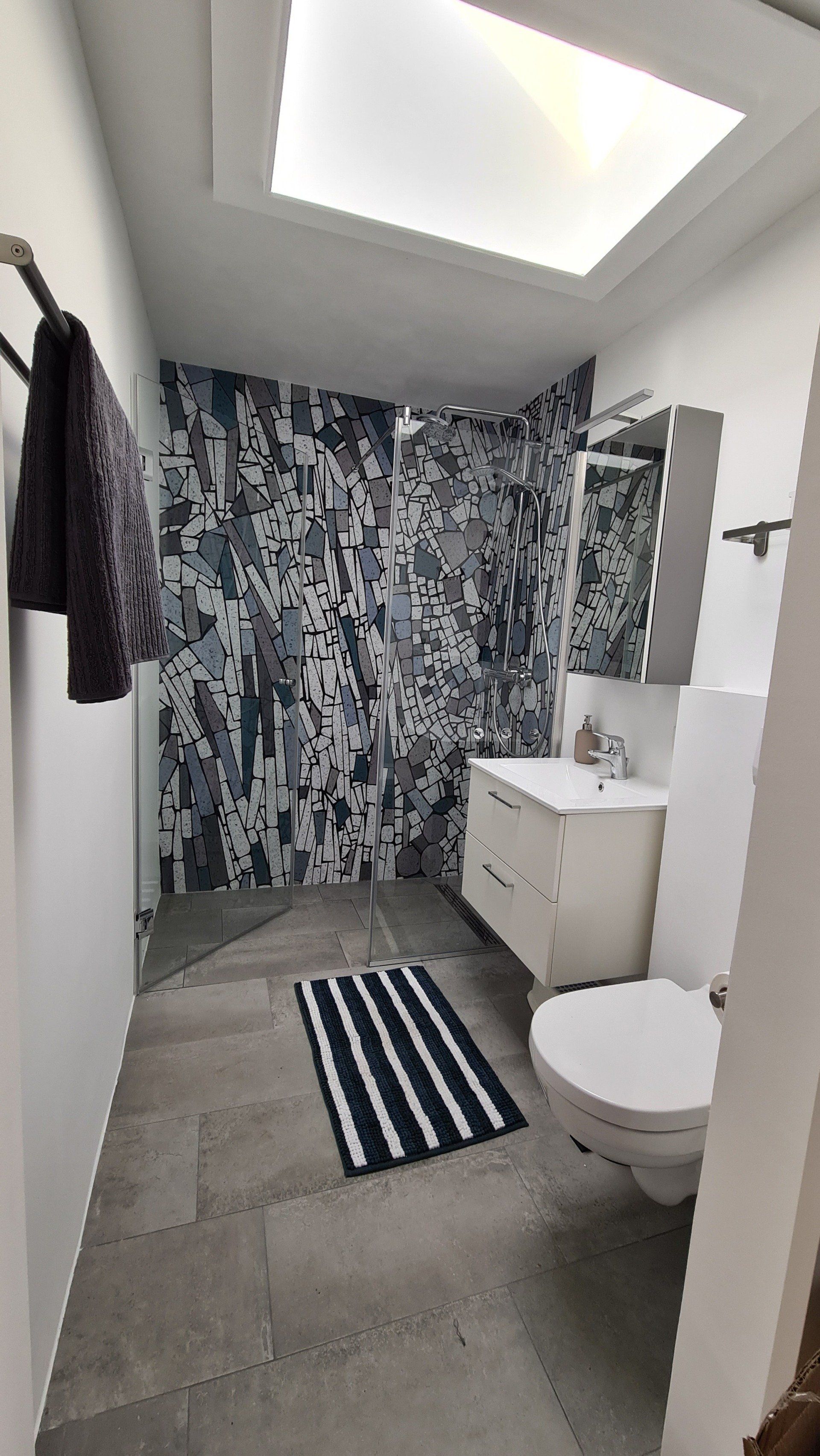 Warme Füße auf Knopfdruck im Winter (die Lofec-Fußbodenheizung macht es möglich), eine Glamora-Duschtapete als Highlight für die Augen, eine die Raumluft reinigende KalkKind-Decke für die Gesundheit und die Stimmung erhellende Lichtelemente für die Seele, das Badezimmer des Ferienhauses Nixe in Norden-Norddeich wird zum Wellness-Bereich für die Gäste des Hauses.