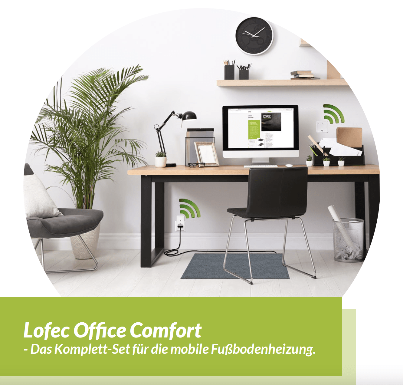 Ob im Büro oder Home-Office, mit der Lofec Office Comfort Heizmatte bieten wir Ihnen die optimale Lösung für angenehm warme Füße. Das durchdachte Komplettset unseres Partners - Lofec - kommt als mobile Fußbodenheizung zu Ihnen und bringt die Wärme punktgenau dahin, wo Sie sie benötigen.